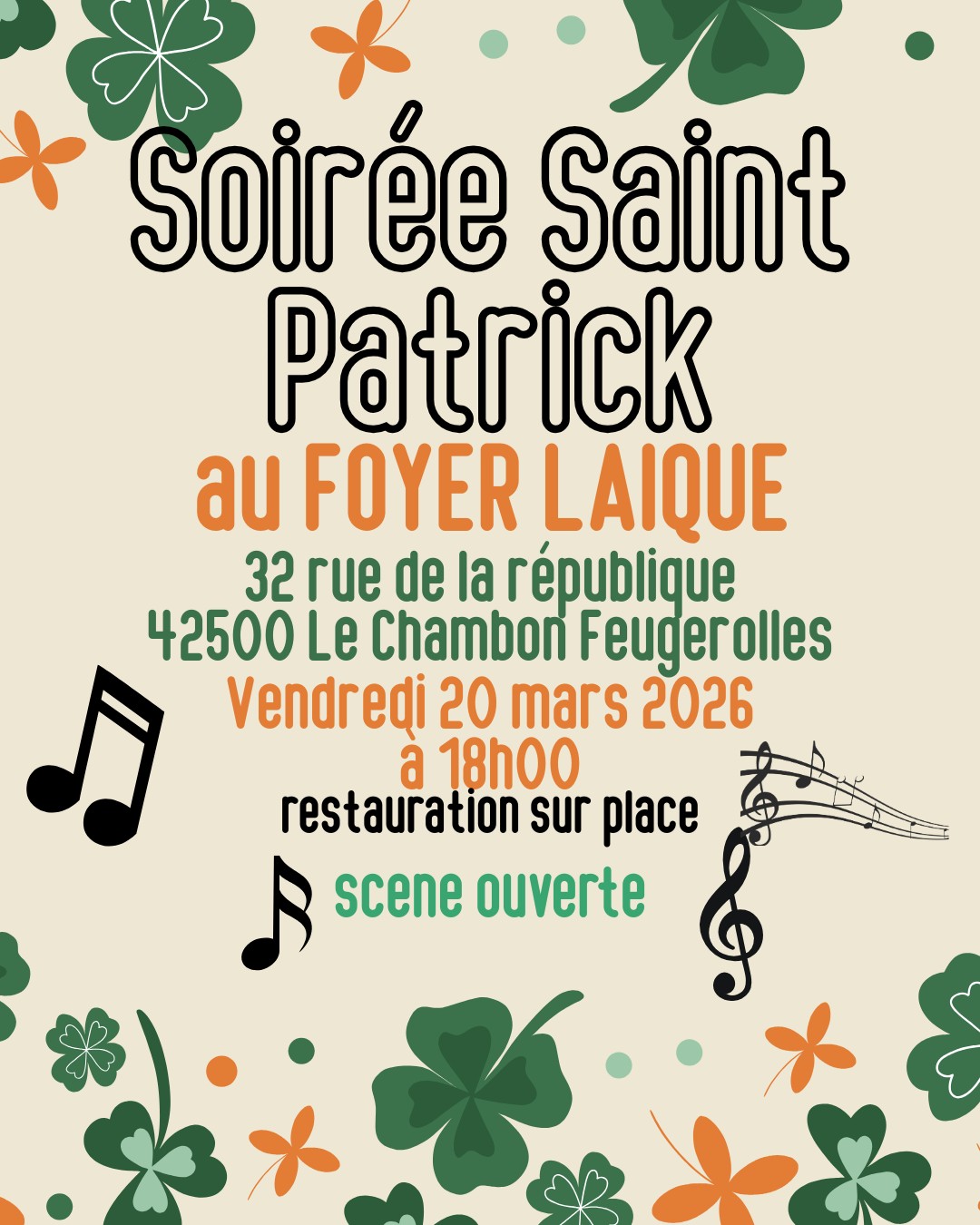 La section BASKET du Foyer laïque organise une soirée à l'occasion de la ST PATRICK. Soirée ouverte à tous, n'hésitez pas à venir nombreux pour profiter d'un moment festif.